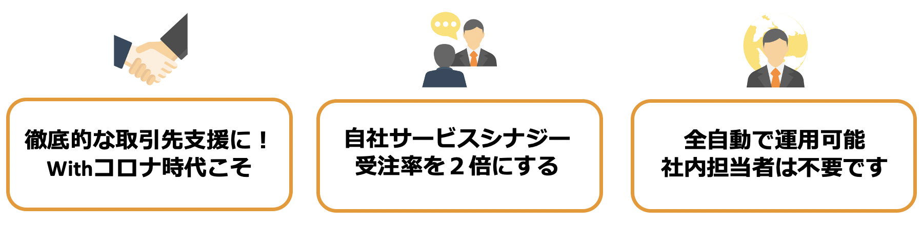 ITに理解ある大手ネット銀行さま、大手損保さま初め、FC本部さまや経営コンサル、士業事務所さままで規模の大小を問わず導入されています。既存顧客支援施策として、新規見込み顧客獲得施策として、自社サービス受注率向上施策として、その使い方は様々です。