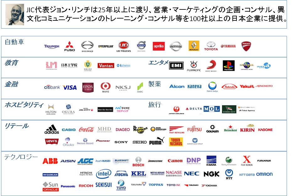 JIC代表ジョン・リンチは25年以上に渡り、営業・マーケティングの企画・コンサル、異文化コミュニケーションのトレーニング・コンサル等を100社以上の日本企業に提供。