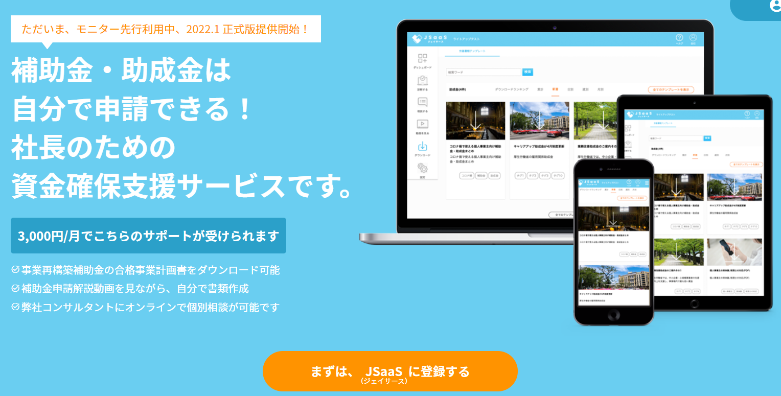 JSaaSは、補助金・助成金を申請する社長のための経営支援サービスです。月額3,000円で、事業再構築補助金を始めとした主要補助金の合格事例をダウンロードし、動画を見ながら【経営者が自学自習】することが出来ます。