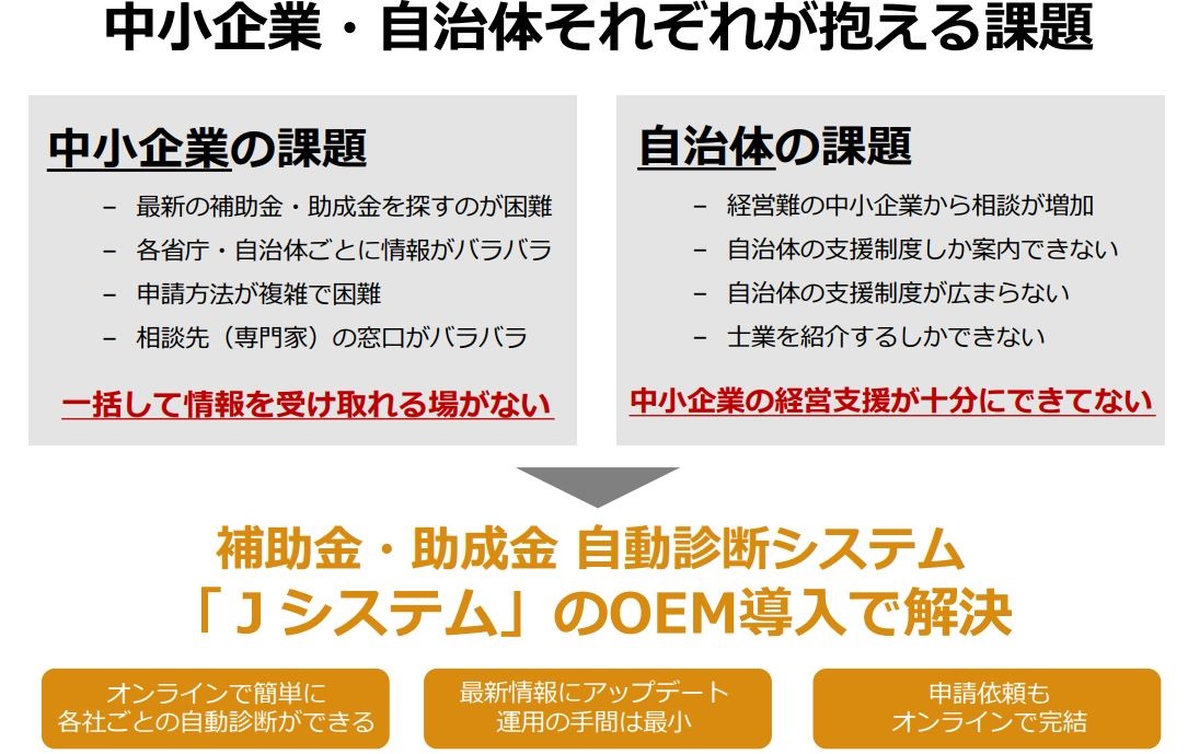 2020年4月から助成金自動診断「Jシステム」のOEM提供を開始。金融機関を始め、自治体や一般企業が本システムを駆使し、全国の中小企業へ助成金・補助金支援の取り組みを開始。業務提携先が日々増加し、全国に広がっている。- 主催