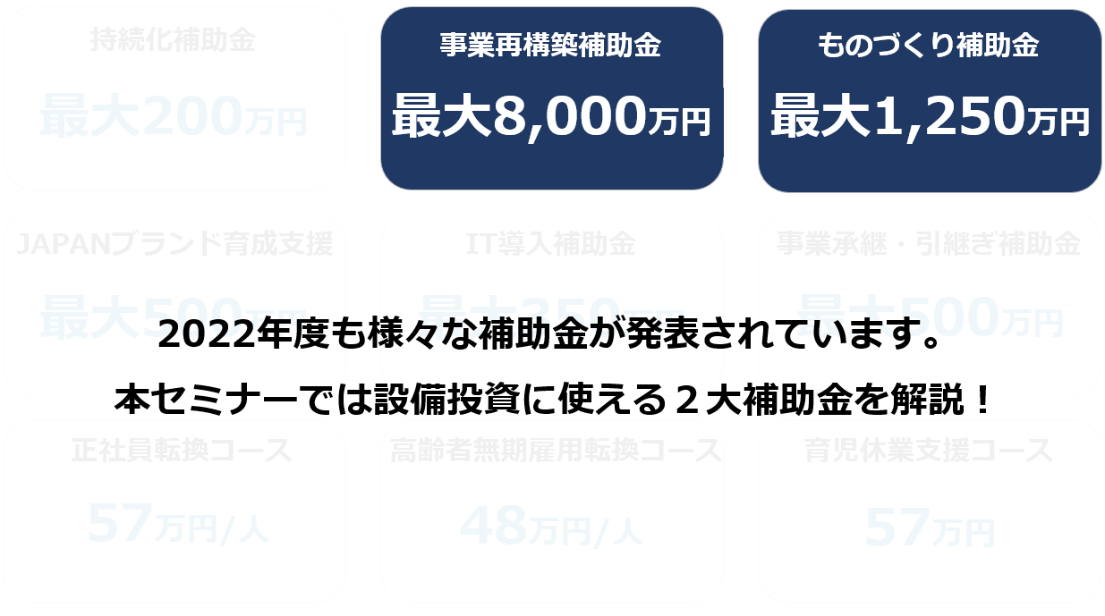 2021年大人気だった「事業再構築補助金」、毎年定番の「ものづくり補助金」「小規模事業者持続化補助金」「IT導入補助金」「キャリアアップ助成金」をはじめ、2022年も多くの中小企業向け制度が発表されています。本セミナーでは設備投資をお考えの方に最適な「2大補助金」について徹底解説します!