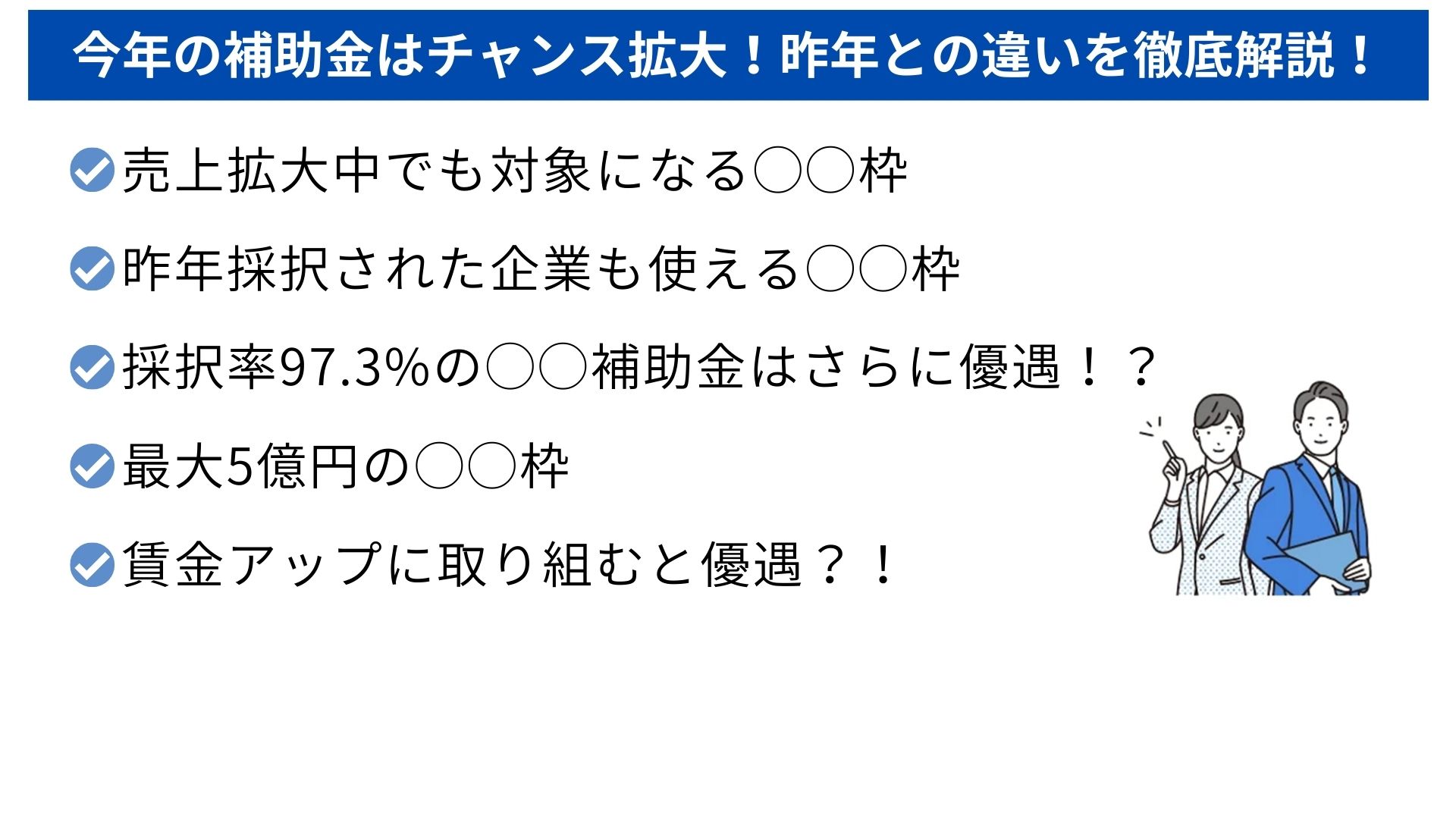 そして、大幅拡充された○○○助成金が狙い目いよいよ始まった新年度、3年ぶりに主力である2つの補助金がリニューアル。