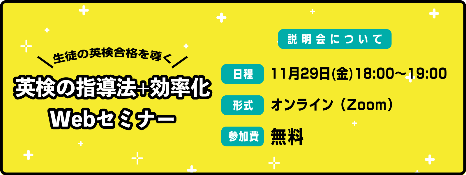 入試対策としても重要な加点要素となる「英検対策」を取り入れたい方向けに、実際の導入事例やカリキュラムの説明、その他、英検指導方法についての説明会を開催いたします。