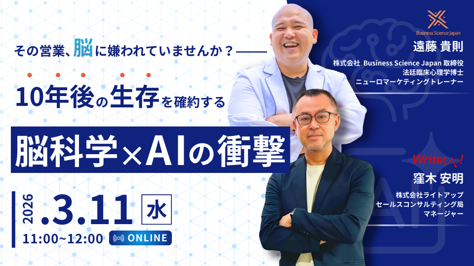 ニューロマーケティング・脳科学の第一線で活躍する遠藤 貴則氏(Business Science Japan)と、営業ノウハウをAIに集約し、現場で成果を出し続けてきた窪木 安明氏(ライトアップ)が共催という形で登壇。