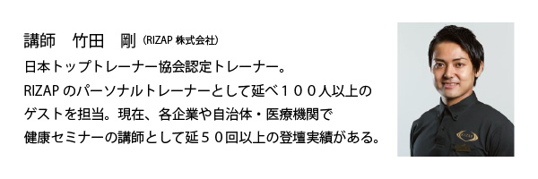 当日はRIZAP株式会社の竹田講師(日本トップトレーナー協会認定トレーナー)より、その場でできるトレーニング体験もございます。