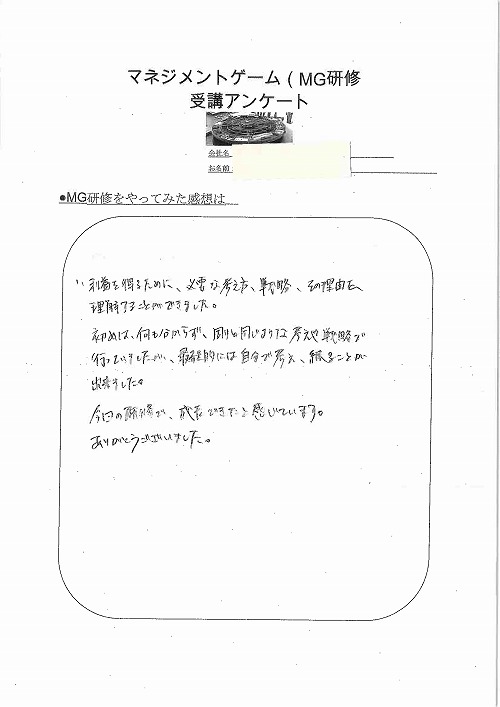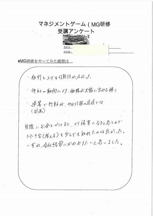 今までグループ会社を通じて社内若手有志でMG研修の集合研修版に参加していました。 私自身も参加しましたが決算書を書くのは難航しました。ゲーム感覚とは言え、頭を使いますね。 原価・販管費計算などを通して、コスト意識・利益を生み出す大変さを実感でき、戦略の大切さも思い知りました。適当な打ち手だと負債にならなかったとしても大きく利益は生めず、さらには思惑通りにはいかない外部要因からの軌道修正・対応力も問われます。 今回、オンライン版が登場するとのことで研修担当としてはとても期待しています。100人単位でフレキシブルに研修実施出来るのが魅力です。集合研修版ではせいぜい5期くらいしか出来なかったので、オンライン版で継続的な学びを推進できるようになると、活用の幅も広がると思います。私も今度はオンラインで参戦できることを楽しみにしています。