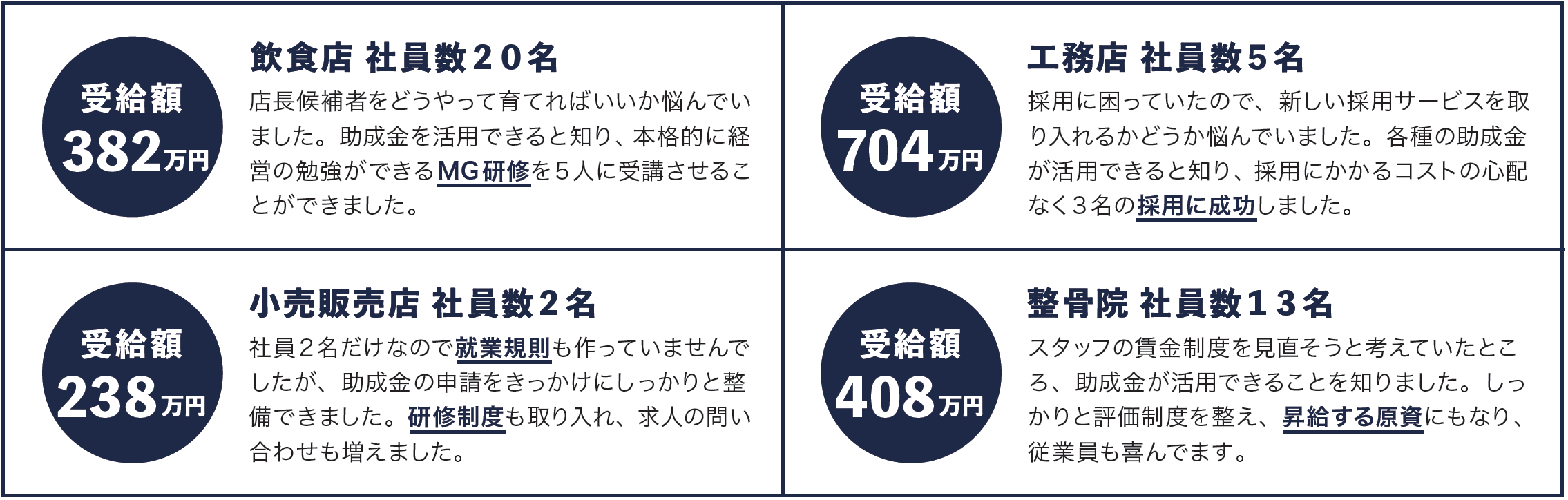 ・受給可能な「助成金の種類と総額」が計算できる